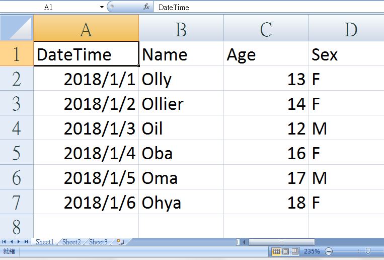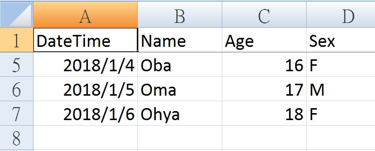 A2 = 2018-01-01 00:00:00 B2 = Olly C2 = 13.0 D2 = F ★~~~~~~~ End of row ~~~~~~~★ A3 = 2018-01-02 00:00:00 B3 = Ollier C3 = 14.0 D3 = F ★~~~~~~~ End of row ~~~~~~~★